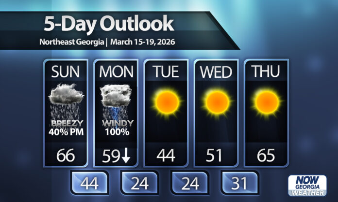 A strong arctic cold front is expected to bring a risk for severe storms then flurries to North Georgia on Sunday night into Monday.