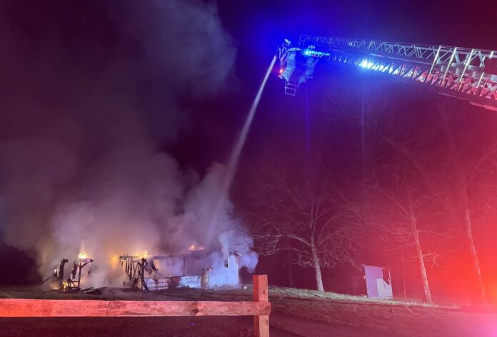 Firefighters use a ladder truck to fight a house fire on Wolf Pit Road in the early morning hours of Saturday, March 14, 2026. (Eastanollee Fire Department/Facebook)