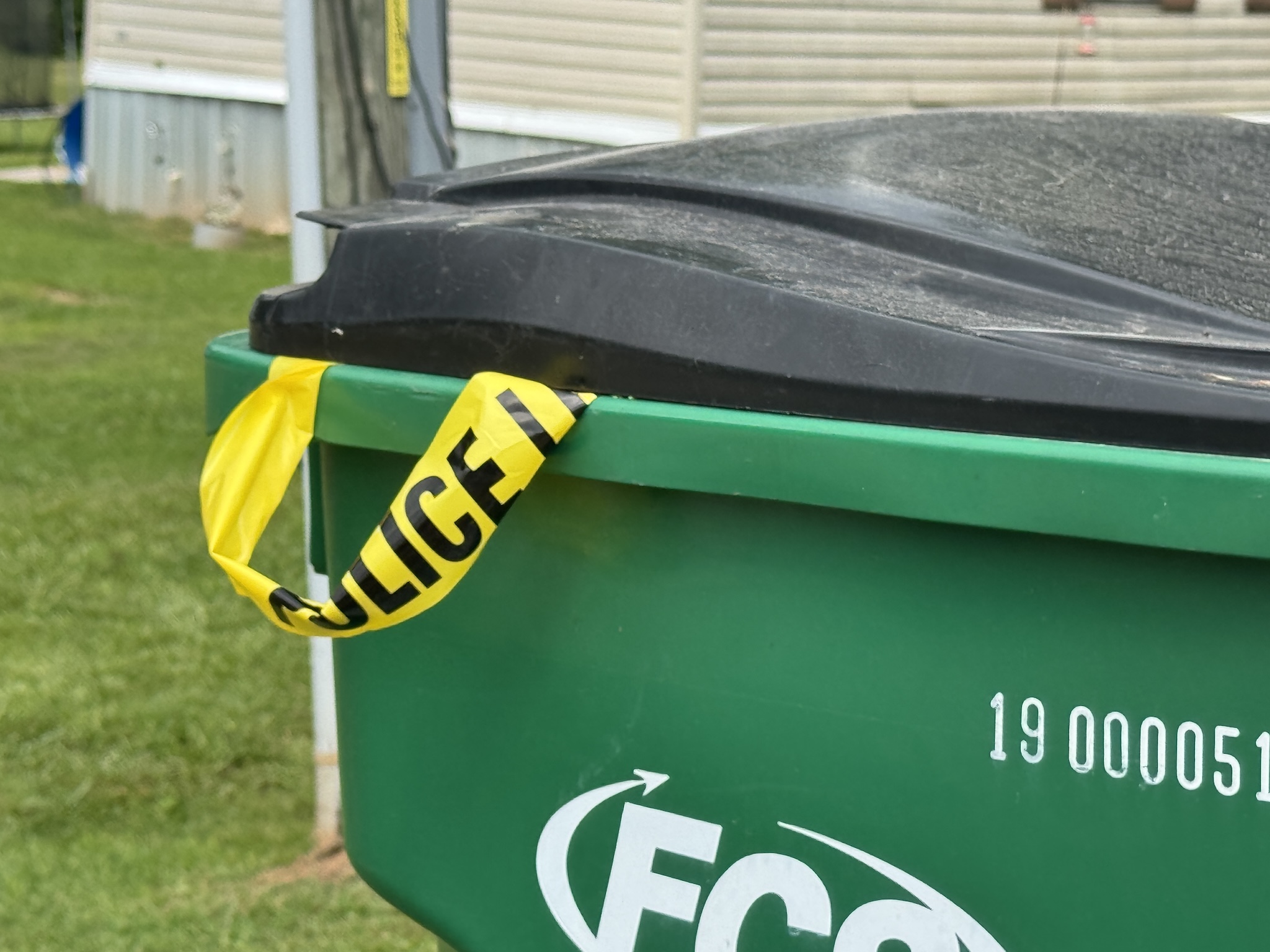 Crime scene tape in a trash can at the site of the stabbing and standoff on Sunday, Aug. 31, 2025. (Joy Purcell