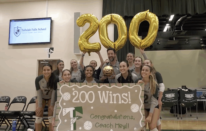 Tallulah Falls’ all-time winningest coach Matt Heyl reached a new milestone with his 200th career win with the Lady Indians volleyball team. The win came on September 2 with a 2-0 victory over George Walton in front of the home crowd. The team celebrated him afterwards, and TFS formally acknowledged the occasion with a mid-court recognition between the win and the 201st against Banks County.