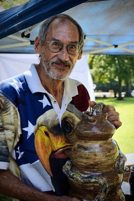 I always enjoy having the opportunity to talk with the artists personally and thoroughly enjoyed conversations with potters and painters at the festival. It as the work of potter Aubrey Lewallen that most called to me personally. Aubrey is a self-taught potter who’s only been working with clay for four years. Yet, he was invited to display his pottery last year next to long-time, seasoned potters. He admits that the opportunity was a little daunting. Aubrey has chosen not to work as a potter’s apprentice, as is customary, so he can truly listen to his own creative voice. Aubrey describes his process as completely trial and error, and sometimes his creations even surprise him. Aubrey resides in Lula and works full time when he’s not creating.