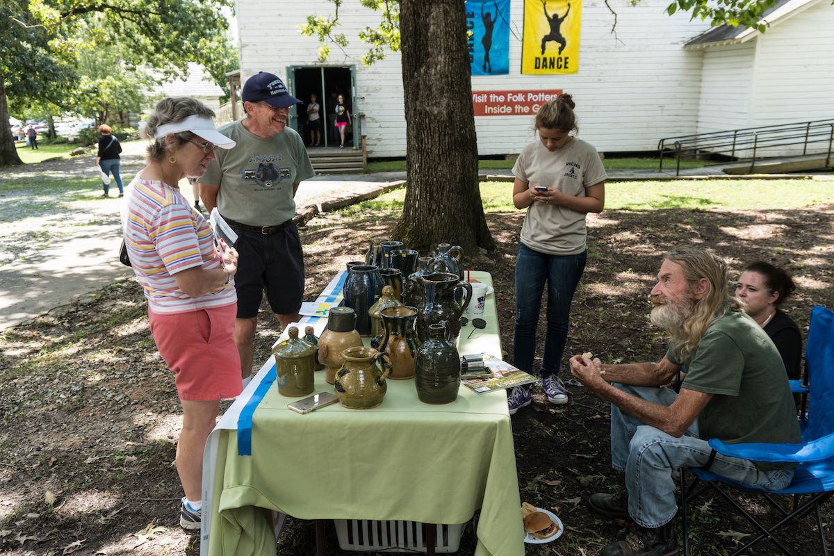 A potter speaks with festival-goers during the Folk Pottery Show & Arts Festival on the grounds of the Sautee Nacoochee Center near Helen. (SNC photo)