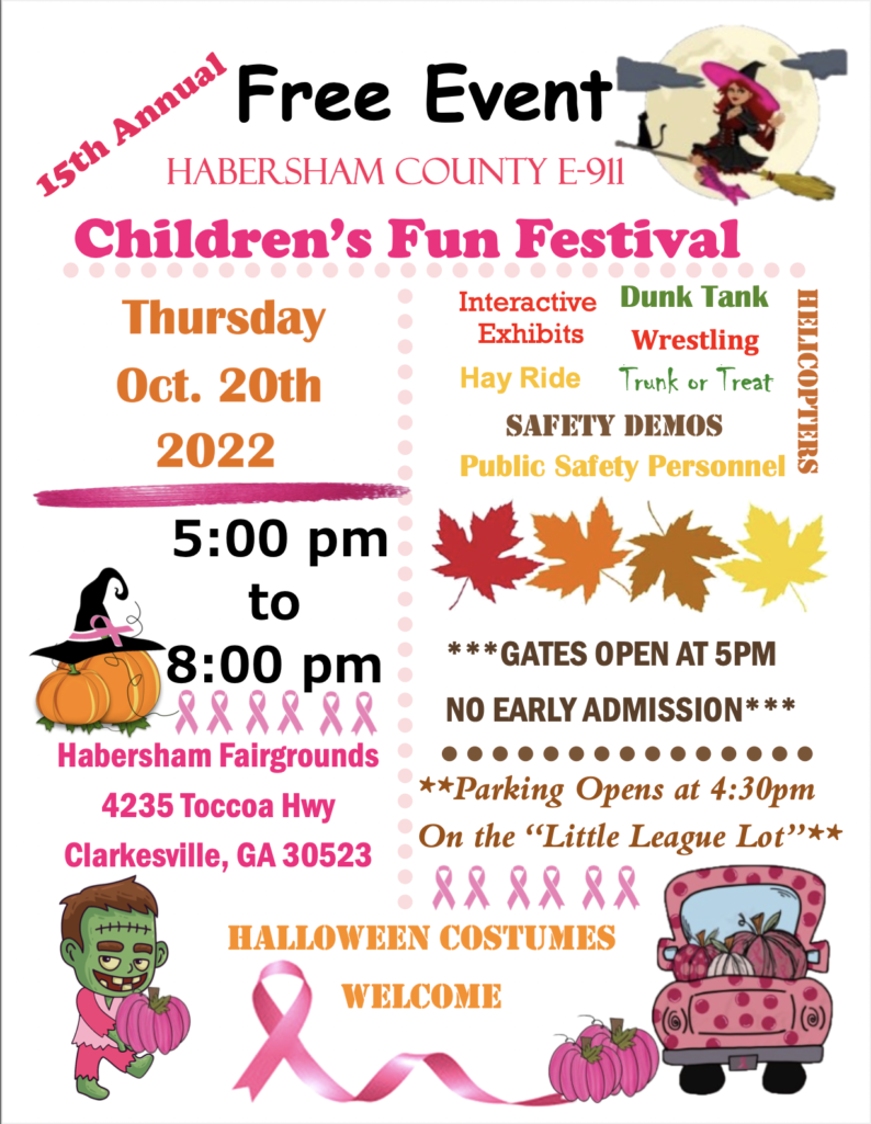 Thousands of people are expected to gather at the Habersham County Fairgrounds Thursday for the 15th annual Habersham County E-911 Children’s Fun Festival. The festival will run from 5 to 8 p.m. at the fairgrounds located at 4235 SR 17/Toccoa Highway in Clarkesville.