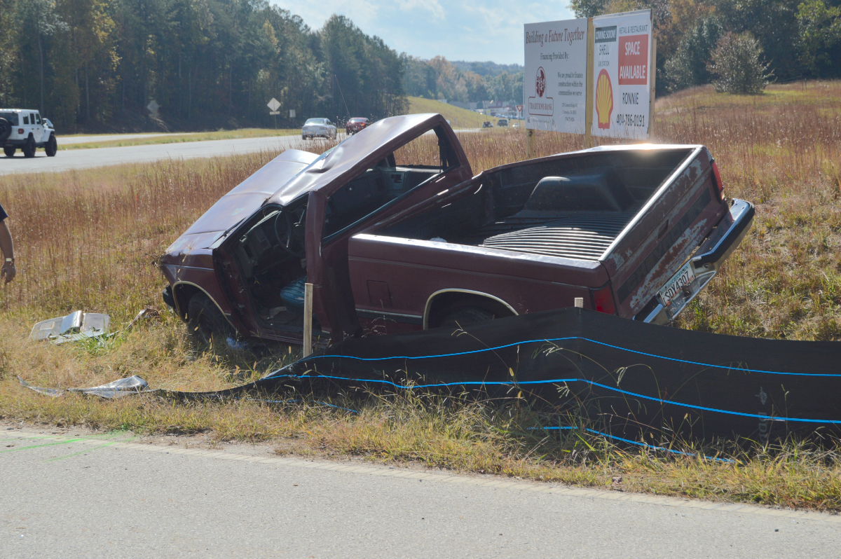 The driver of this Chevy S-10 pickup truck was seriously injured when he pulled into the path of an oncoming vehicle on GA 365, troopers say. (Jerry Neace/NowHabersham.com)