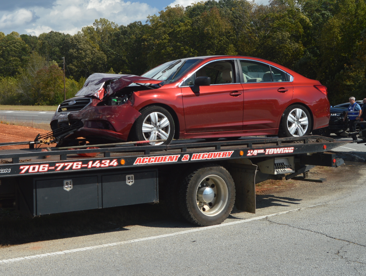 The driver and passenger in this Subaru Legacy sustained possible minor injuries. (Jerry Neace/NowHabersham.com)