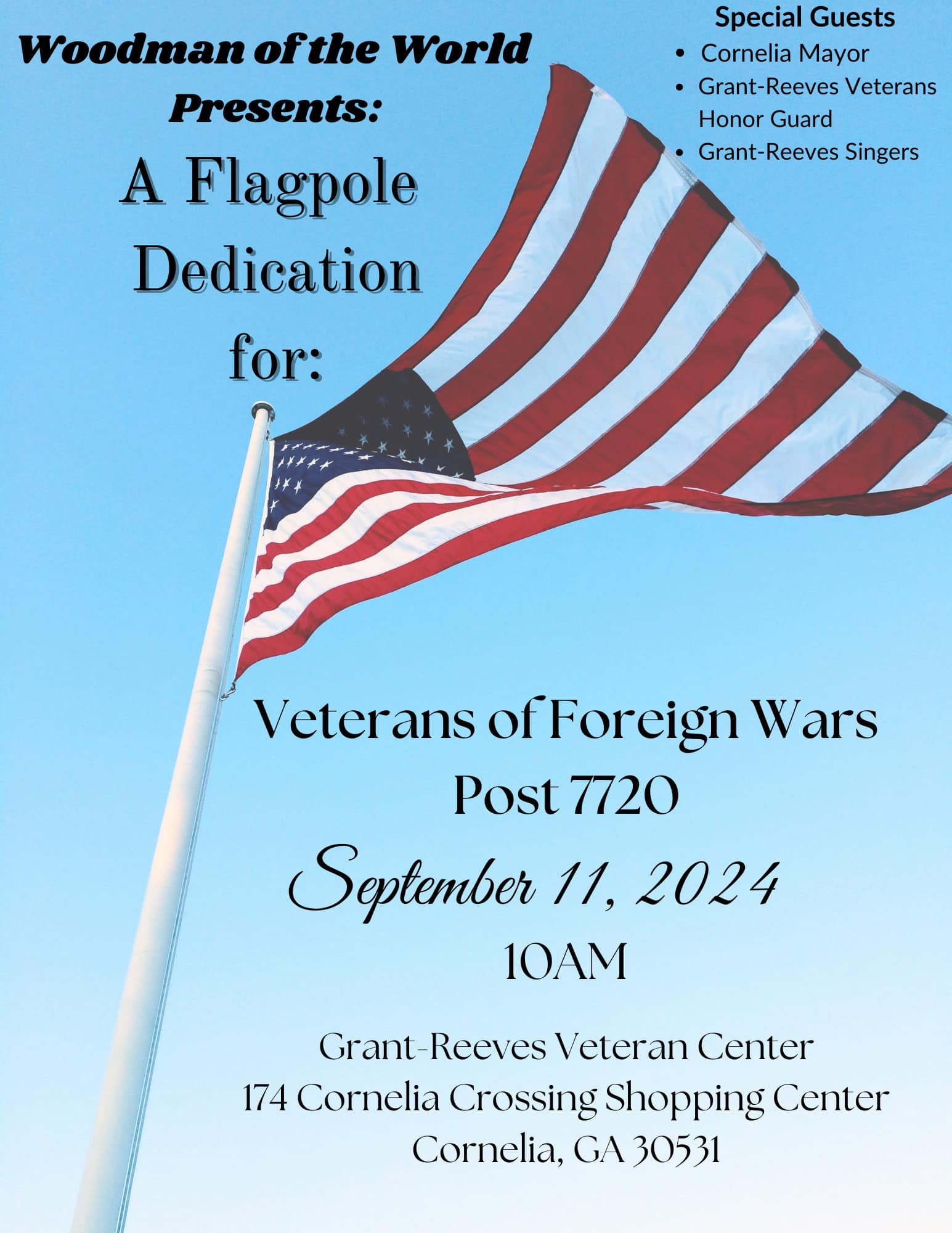 Local veterans and the community are invited to participate in a September 11 flag pole dedication ceremony at the Grant Reeves VFW 7720 in Cornelia.