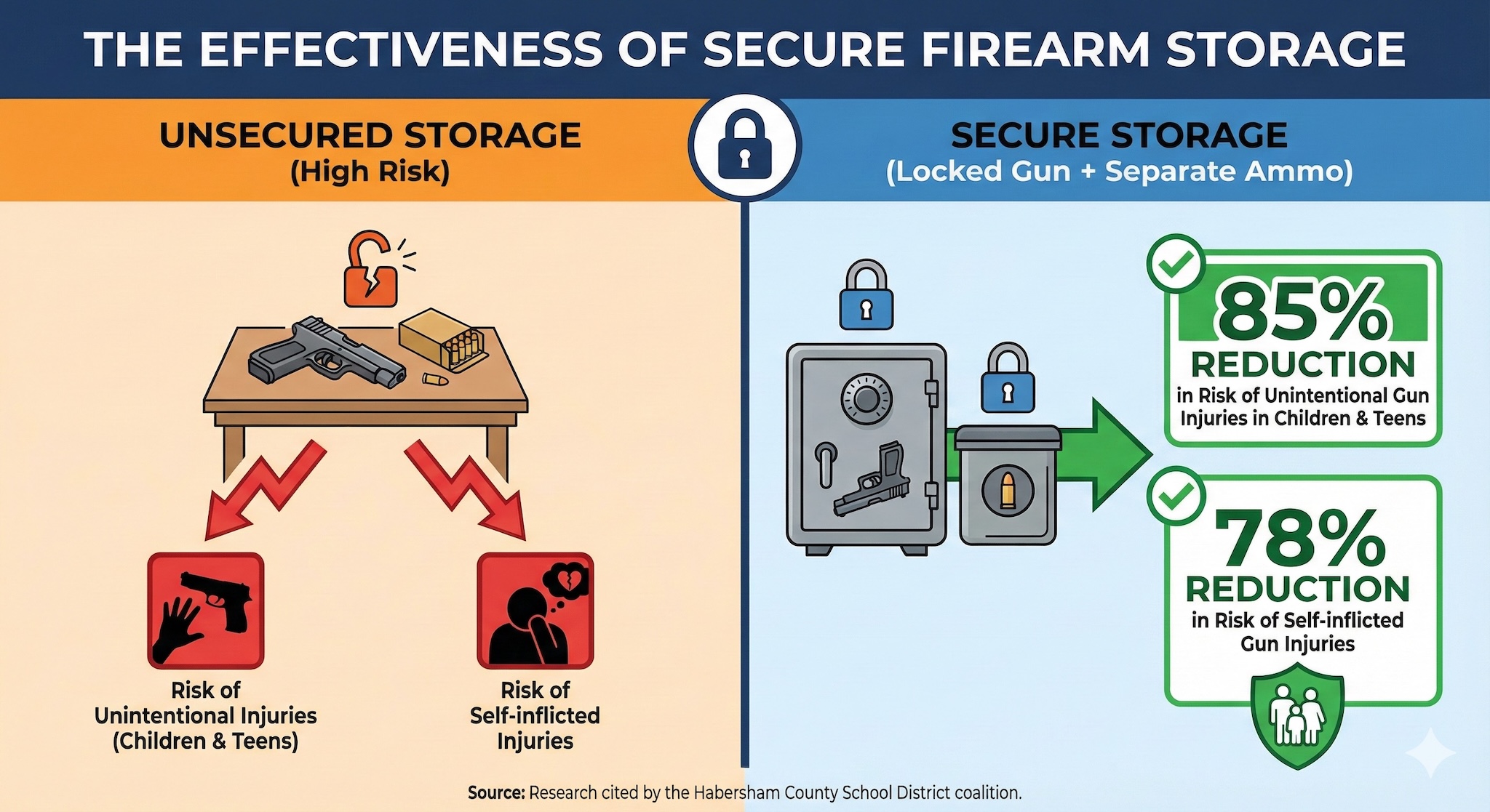 The coalition aims to educate the public on the effectiveness of proper firearm storage. Research cited by the district indicates that when guns are locked and secured—with ammunition stored separately—the risk of unintentional gun injuries in children and teens drops by 85%. Furthermore, secure storage results in a 78% reduction in the risk of self-inflicted gun injuries.