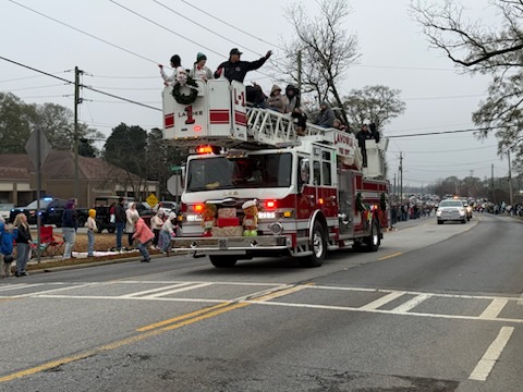 Firefighters wave to the crowd from atop a ladder truck during the Franklin County Christmas parade in Lavonia on Sunday, Dec. 7, 2025. This year's parade theme was "A Classic Christmas in Lavonia."(NowHabersham.com)