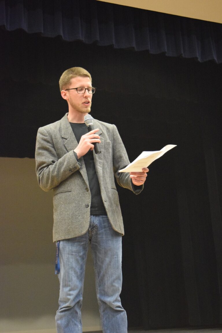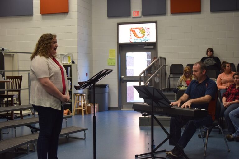 The evening kicked off in rousing fashion with the high school cast of the spring musical Footloose performing one of their show-stopping numbers. The show is now in rehearsal, under the watchful eye of drama teacher Jeremy Bishop. Bishop was on hand Tuesday to welcome those gathered.