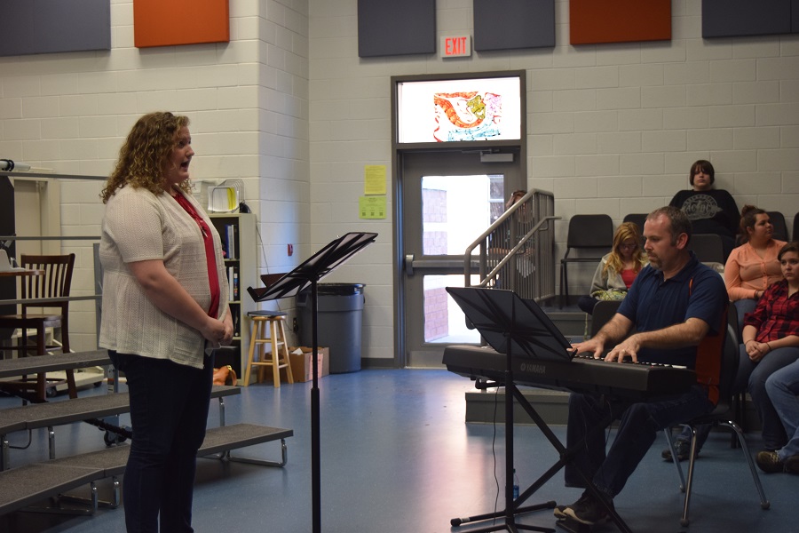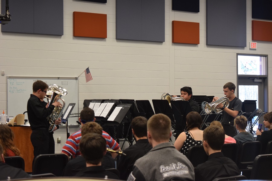 The cafeteria hosted solo and duet performances by singers and drama students along with monologue presentations. In the Upper Lobby, two different murals were unveiled at two different time periods. The Band room was home to Band of Blue performances as well as a Baritone Quartet and and a vocal performance with piano accompaniment. The Chorus Room was home to small ensemble and All-State Solo performances. HCHS Choral Director BJ Addison even invited guests to practice their sight reading skills alongside students while singing the HCHS Alma Mater and If Ye Love Me by songwriter Thomas Tallis. The Main Lobby showcased student drawings and paintings which were visible to guests walking through the building’s visual arts section.