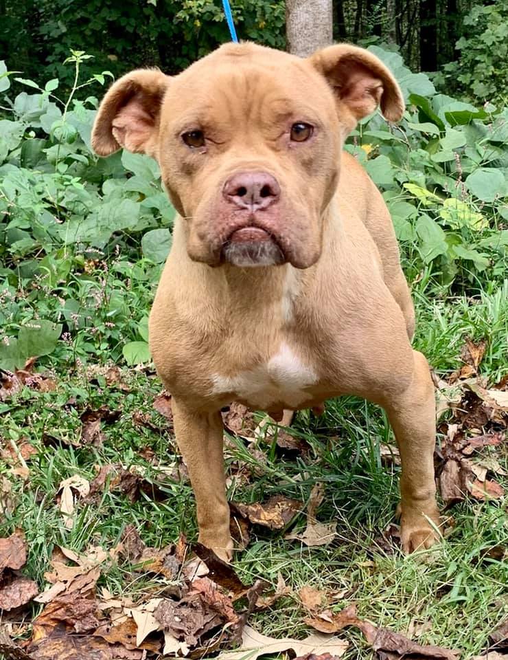Meet Hazel, an adult female terrier pit mix with the cutest grumpy face.