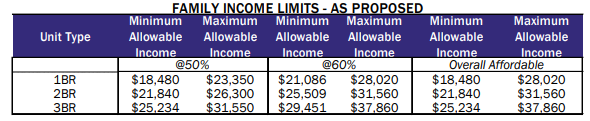 The LIHTC project requires that the development be available to low-income seniors and families; income restriction is set differently for different apartment sizes. For example, a family making more than $28,020 a year would not be able to rent a one-bedroom apartment in the developing complex.