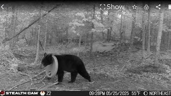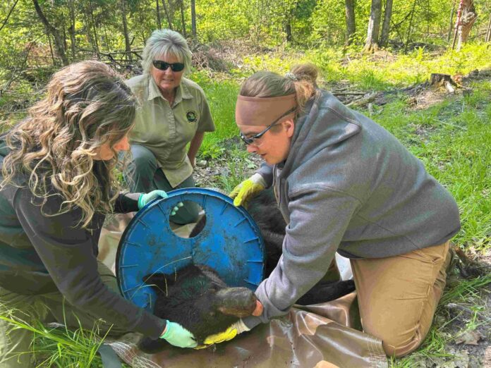 Biologists at the DNR’s Atlanta field office were first alerted to the bear’s predicament in 2023 through trail camera photos showing a cub with his head stuck in the lid. He proved elusive over the next two years, occasionally appearing in trail camera photos before disappearing after a day or two.