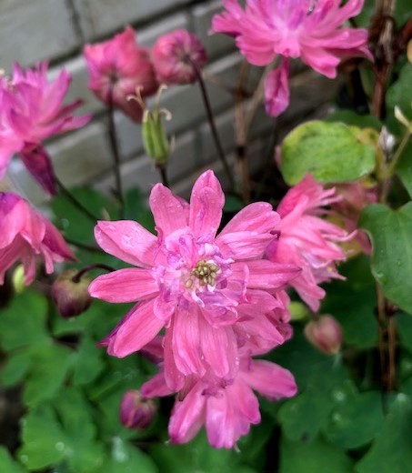 Many years ago, I gave myself the gift of a then-new variety of columbine, a Clementine Salmon Rose. The name alone would have been enough but the color and the fact that it’s a double flowering variety stole my heart. In keeping with the rule for “feet in the shade and face in the sun” this columbine serves as shade at the base of my Franziska Maria clematis.