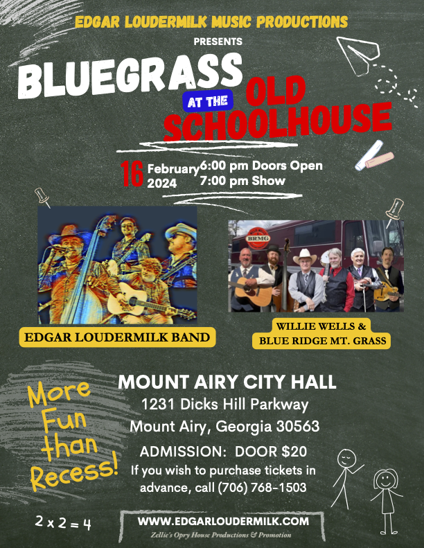 The Edgar Loudermilk Band and Willie Wells and Blue Ridge Mt. Grass will perform in the second of what many hope will become a continuing concert series called “Bluegrass at the Old Schoolhouse.”