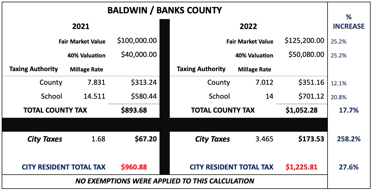 With recent reassessed values and county taxes factored in, the owner of a home valued at $100,000 in 2021 could expect to pay approximately $433 more in taxes this year if they live on the Habersham County side of Baldwin. A homeowner on the Banks County side would see their tax bill rise by approximately $265.