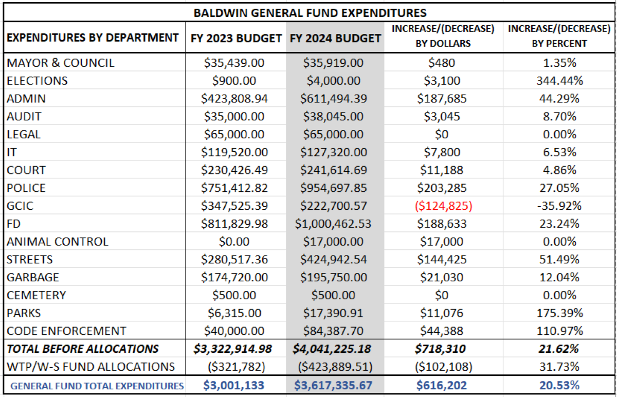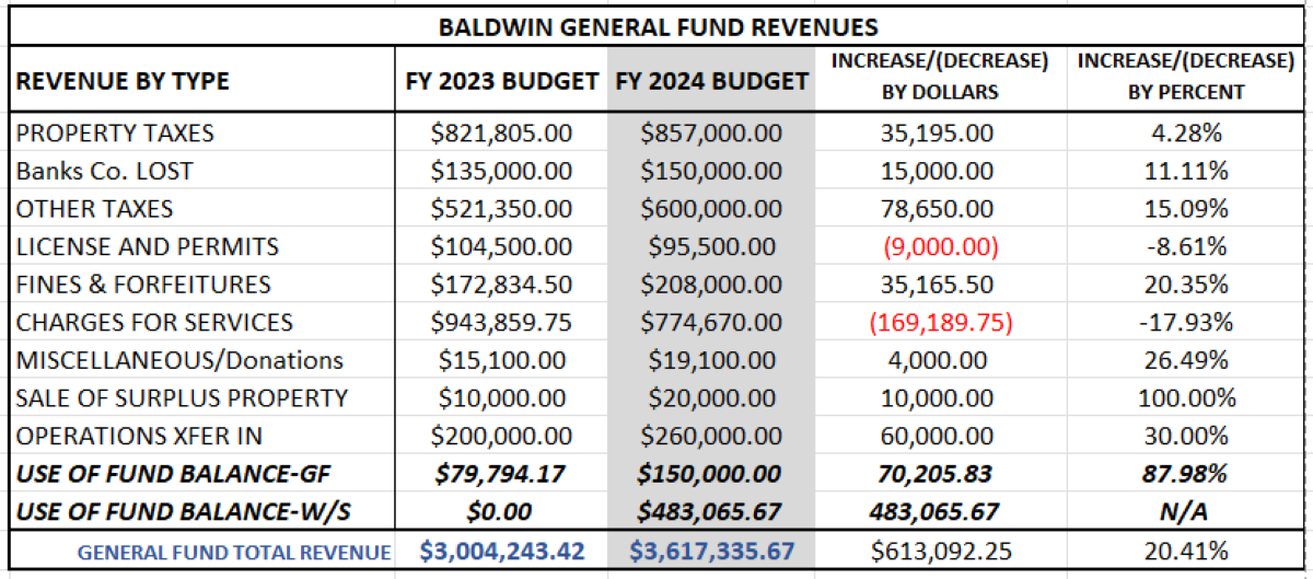 Baldwin will use $150,000 of the prior year’s General Fund balance, as well as $483,068 in prior year fund balance from the Water and Sewer fund, to be transferred into the General Fund coffers. Prior year fund balances will make up $633,065.67 or 21.21% of the revenue in the General Fund for fiscal year 2024.