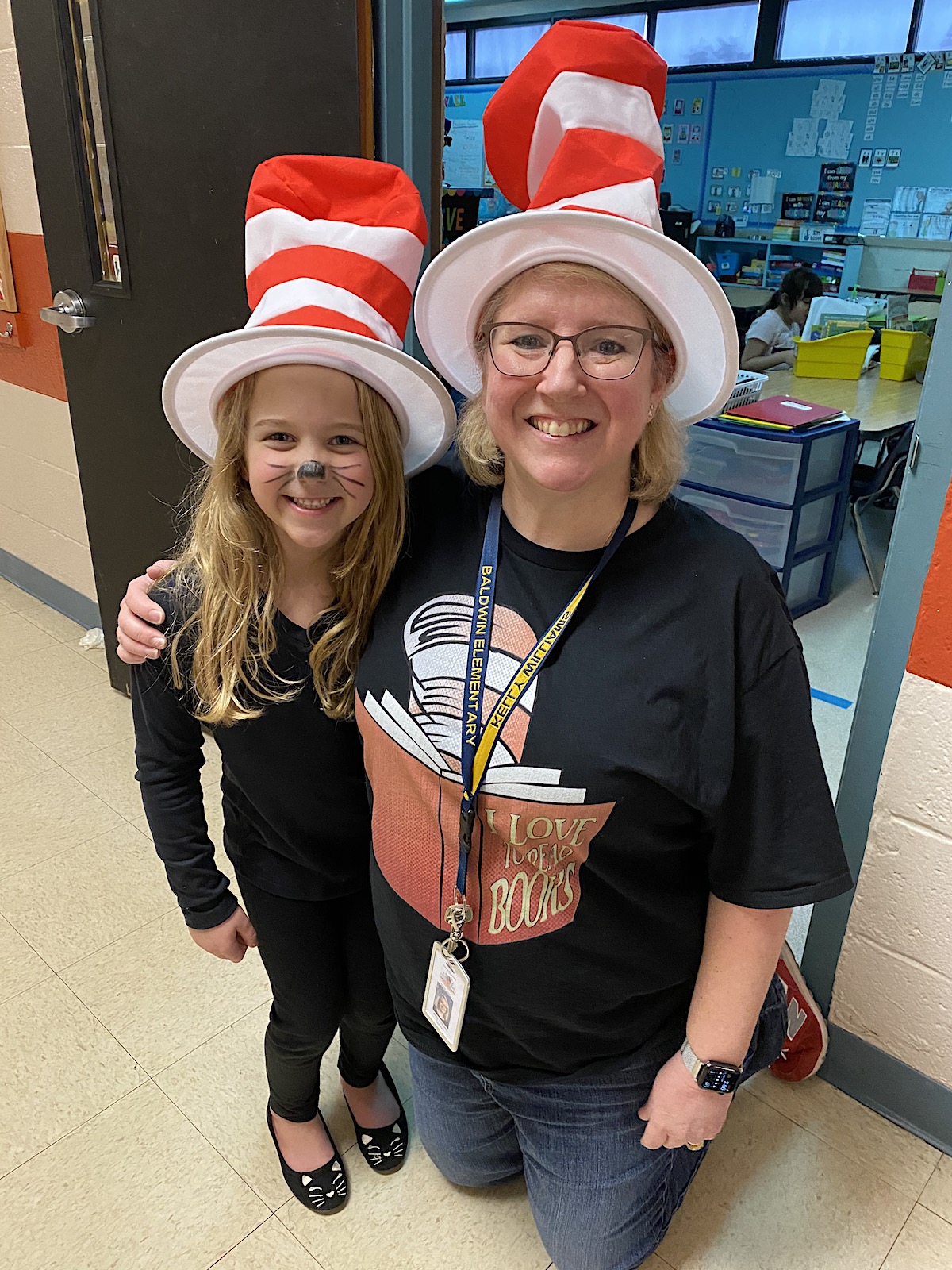 Two cats in their hats. Ruby Shaw and BES 1st grade teacher Kelly Williams celebrate Read Across America Week with a nod to the Dr. Seuss classic, “The Cat in the Hat.” (photo courtesy Baldwin Elementary School)