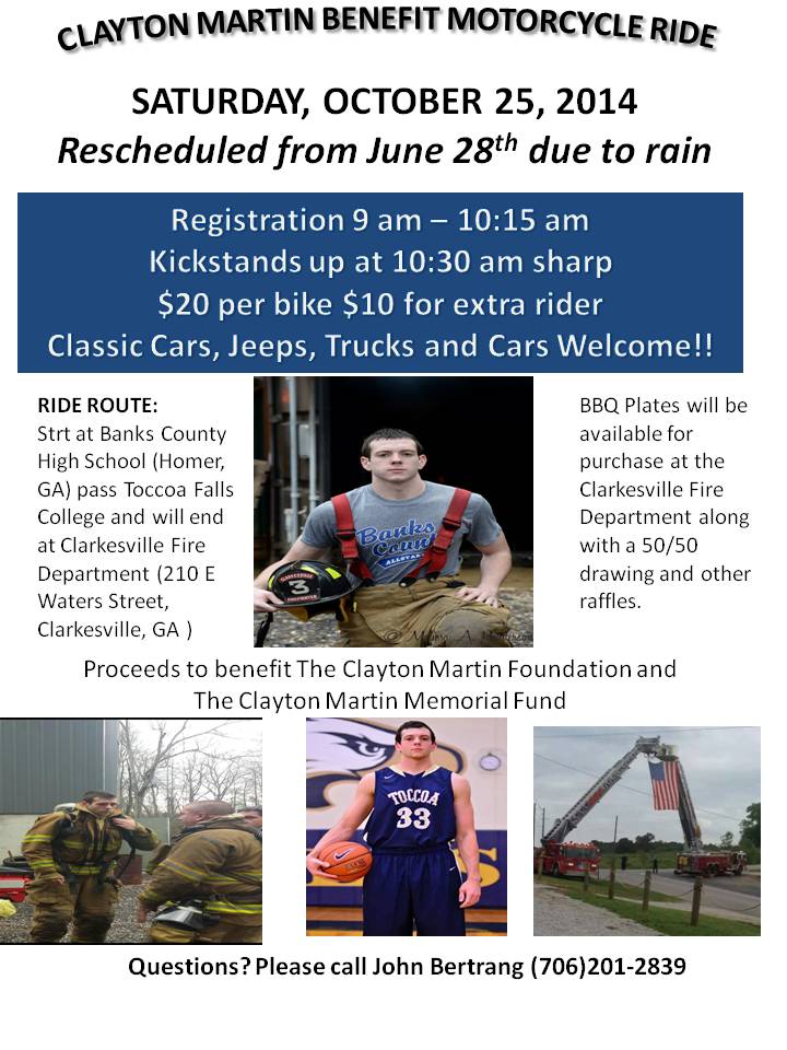 Clayton attended and played basketball at Toccoa Falls College and was also a firefighter with the Clarkesville Fire Department. His mother Juli Tomlin says the purpose of the foundation is to provide scholarships for young people. “Our hope and vision is to help kids in many ways (sports camps scholarships, Christian camps, survival swim lessons, sports and academic scholarships). Saturday’s ride is to help fund this endeavor and is a true labor of love for us,” Tomlin says.