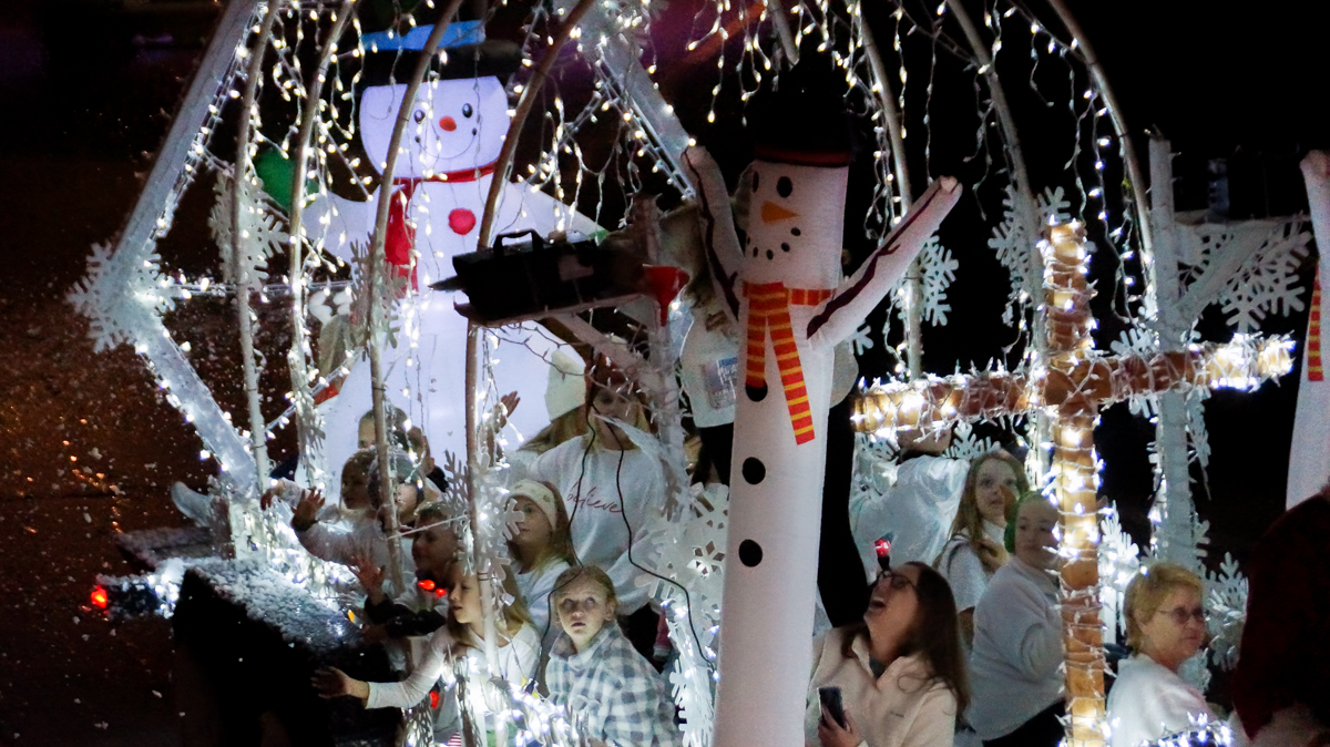 Around 50 lighted floats and vehicles made their way around the square, showcasing businesses, churches, schools, sports teams and many other organizations’ holiday spirit. Children were delighted to see Santa ride in on top of a White County fire truck, and eye-catching costumes and dazzling lights impressed crowds.