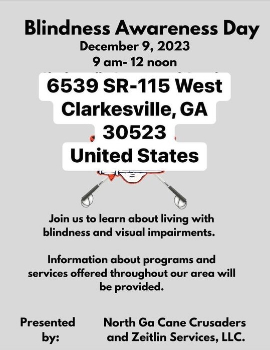 Saturday in Clarkesville, North Ga Cane Crusaders and Zeitlin Services will hold a meeting aimed at helping the visually impaired. They’ll share information on how to access programs and services in Northeast Georgia that can help people with poor or no eyesight build independence and confidence.
