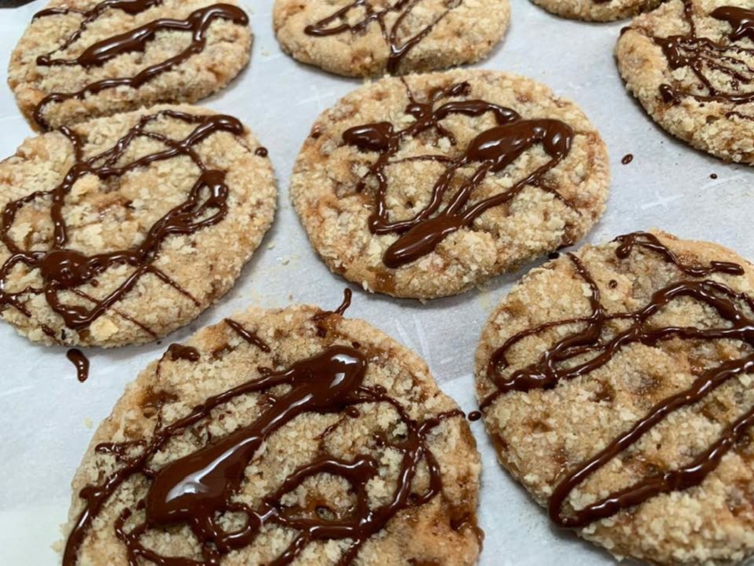 Bake for approximately 22 minutes and then transfer cookies to a cooling rack. Melt the chocolate with the vegetable oil in a double boiler or in a bowl set over a pan of simmering water. Drizzle melted chocolate over cooled cookies.