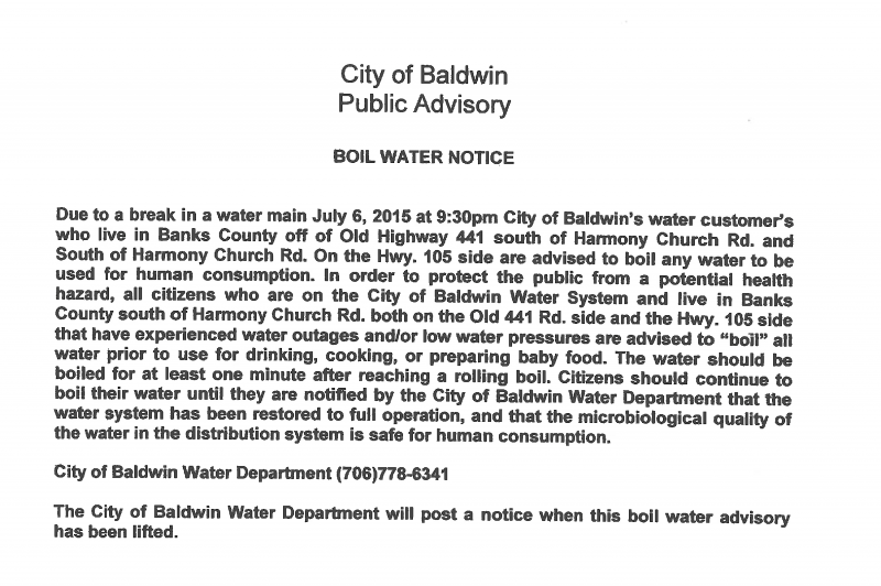 Boil Water Advisory in effect for parts of Baldwin By Joy Purcell - July 7, 2015 FacebookTwitterEmailPrint Issued July 7, 2015 Print Article