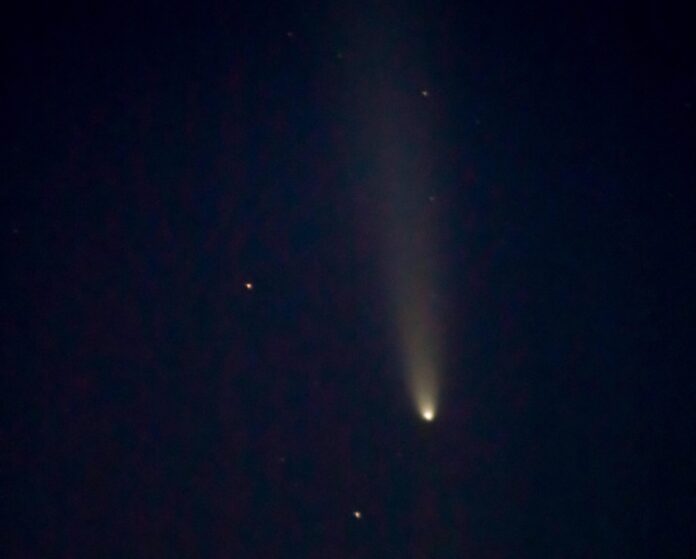 If you are having trouble picking it out, binoculars can help immensely, and once you see it, you won’t miss it. The tail is long and stretches up and left from the comet’s coma or head.