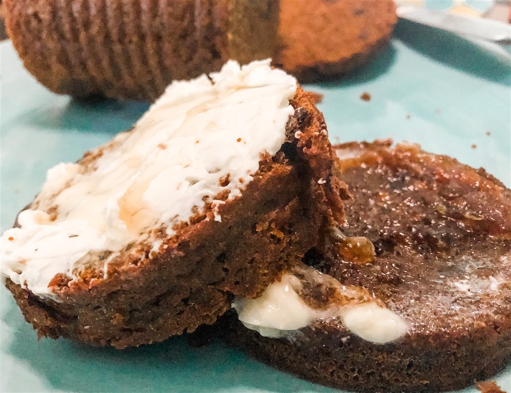 Slice bread to serve. It can be toasted in the oven with butter, heated in the microwave with butter, or served with cream cheese. This recipe was found at Simply Recipes.