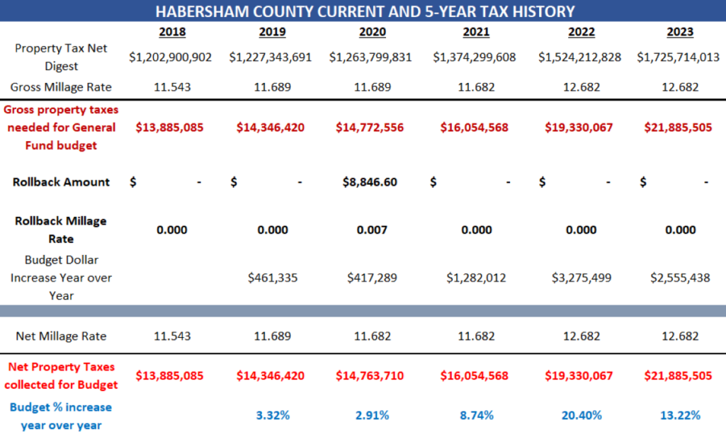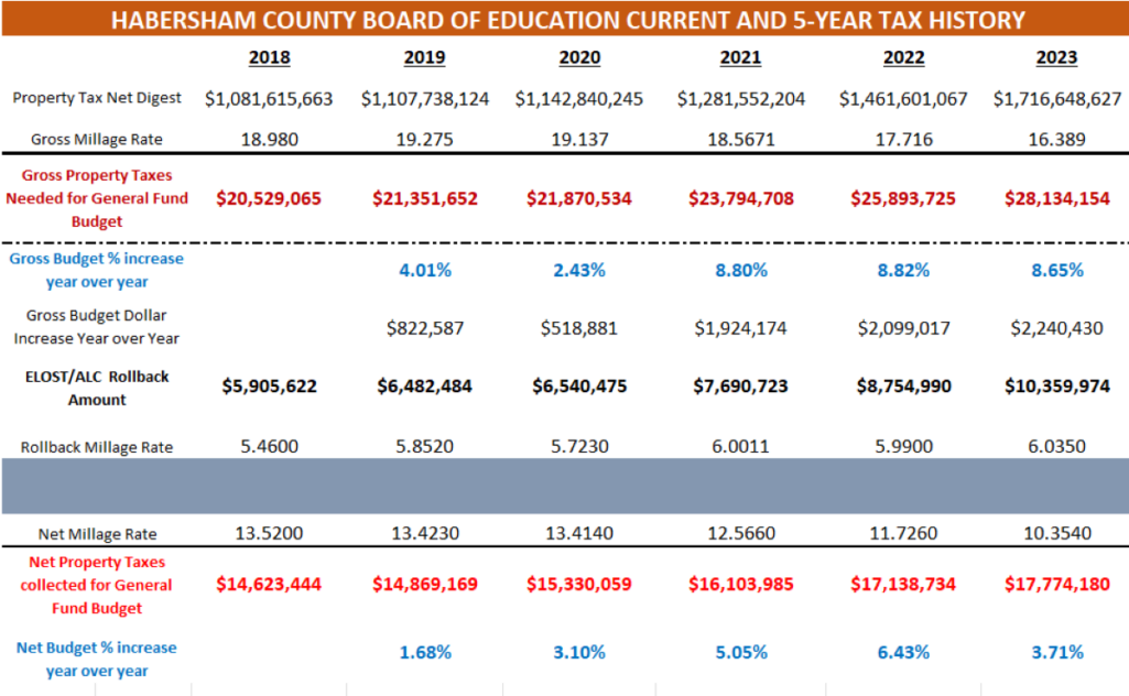 The BOE’s current and 5 year tax history for the county demonstrates the increase over the last six years not only for the net tax digest but also the property taxes needed to pay for maintenance and operations in the general fund budget.