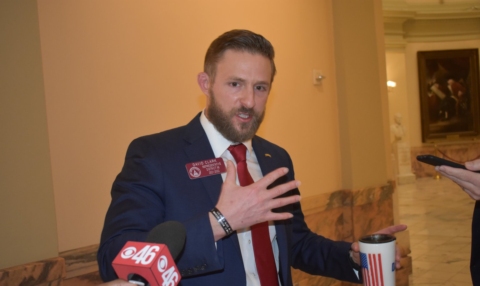 Rep. David Clark, a Buford Republican, makes his case to reporters in the Capitol after he was removed from the House chamber for refusing to take a required COVID-19 test. (Ross Williams/Georgia Recorder)
