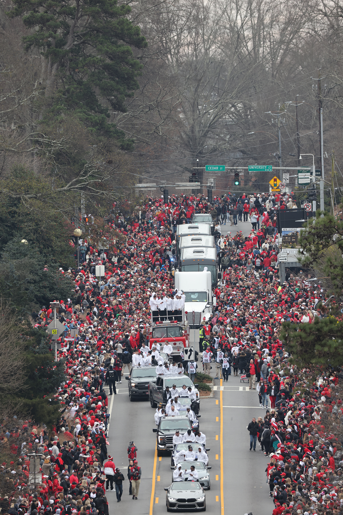 Coach Kirby Smart and his team arrived at the stadium in style, slowly making their way down Lumpkin Street in a victory parade. The parade consisted of about two-dozen vehicles, from sporty convertibles to pickup trucks to some huge 18-wheelers with hay bales on the back. From start to finish, crowds three-, four- and five-people deep lined the road.