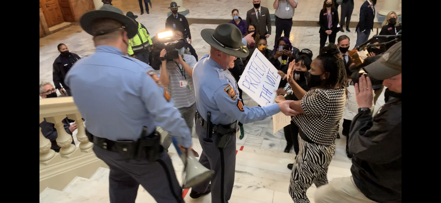 The interaction took place in the middle of a small but loud demonstration over GOP proposals to restrict voting began once lawmakers stopped Friday for lunch.