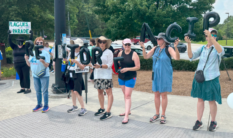 As the committee met inside, dozens of people braved the sweltering heat to hold what they called a “parade of preventable diseases” to highlight the dangers of limiting the public’s access to vaccines. They also called for the committee to be restored to its previous makeup.