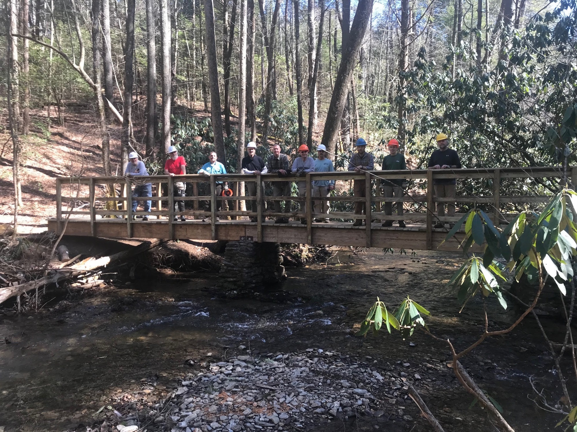 A flash flood wiped out a trail bridge to High Shoal Falls between Hiawassee and Helen. There, staff worked with volunteers to haul lumber and materials down a mountainside so that it could be reopened.