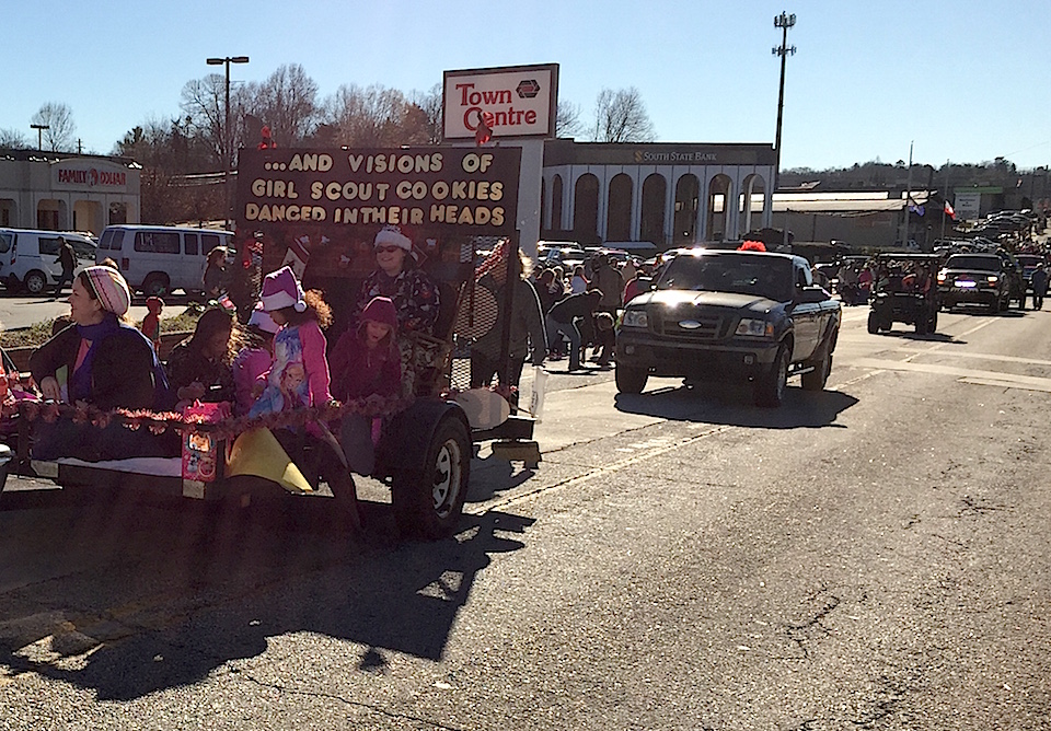 People weren’t shopping on Saturday morning, though. They watched the marching band, with instruments reflecting a blazing sun. They saw little Girl Scouts, some of them dressed like Thin Mints, Do-Si-Dos, Tag-Alongs and other cookies the scouts are proud to sell. They saw a beautiful brown horse, a prancing part of a veterinarian clinic’s float and display. Pride in the community showed in Habersham County’s Christmas Parade, with smiling characters on floats tossing the expected candies into the audience.