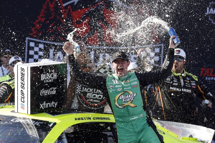 TALLADEGA, Ala. (AP) — Austin Cindric gave Team Penske its first NASCAR victory of the season by holding off a huge pack of challengers over the closing lap in a rare drama-free day at Talladega Superspeedway.