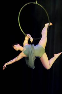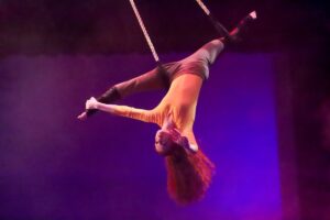 Rabun Gap students perform on apparatuses including the Spanish web, aerial silks, trapeze, German wheel, and aerial Lyra.