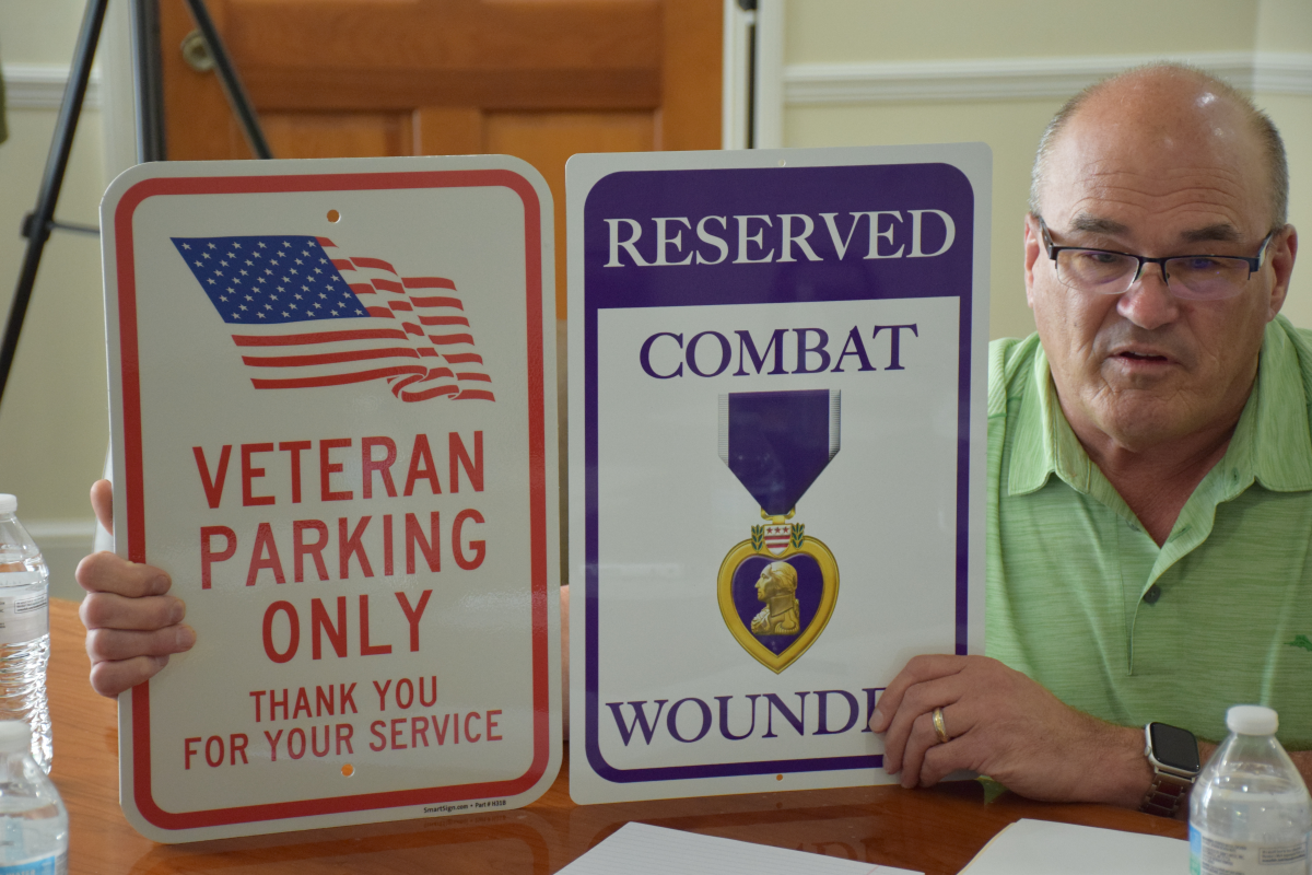 He explained that his idea would be to provide six spots downtown. Three spots would be for veterans and three spots for Purple Heart recipients. Two of the signs would go in the parking lot next to the war memorial and the gazebo. Two signs would be placed in the parking lot beside the police station and the remaining two would be placed in the parking lot near the Copper Pot.