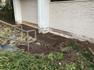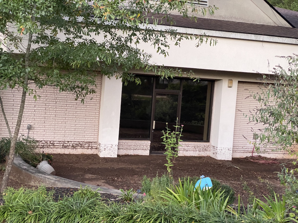 As of late Monday, workers still had not begun cleaning up the exterior of the building where a layer of mud covered up the children’s garden patio and the sidewalk to the staff entrance.