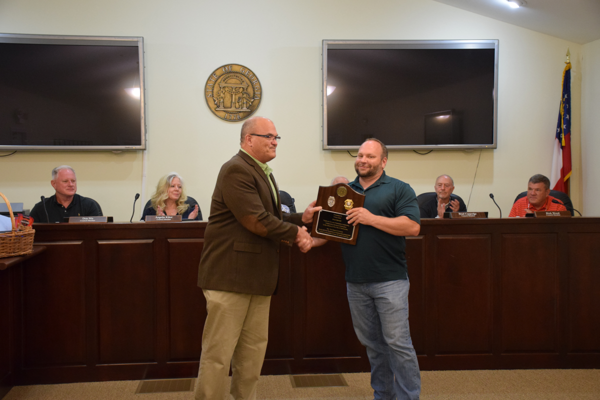 Dickerson presented Barrett with a plaque and read aloud the inscription: “After 22 years, we want to thank you for your exemplary service and dedication to the citizens of the City of Clarkesville. We, the Mayor and Council, along with the residents of Clarkesville, present this to you in recognition of your 22 years of service.”