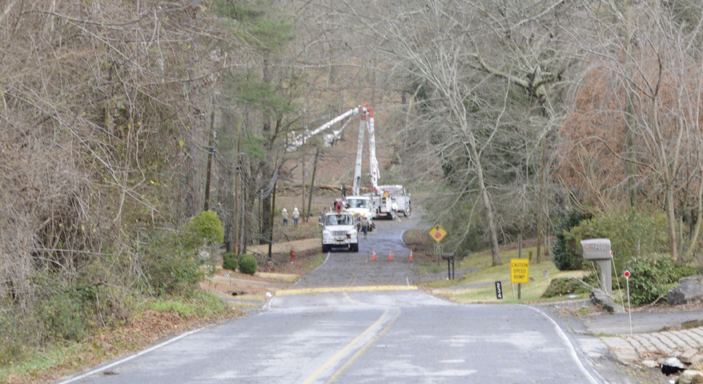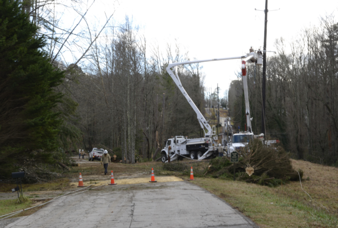 Georgia Power crews work at the intersection of Rocky Branch Road and Gabrels Drive to restore power to the area. (Jerry Neace/NowHabersham.com)
