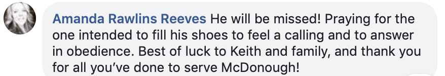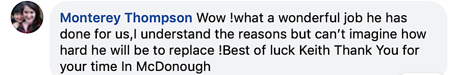 Others commended Dickerson for the work he has done in McDonough. Monterey Thompson wrote, “Wow! what a wonderful job he has done for us!” And Amanda Reeves added, “He will be missed.”