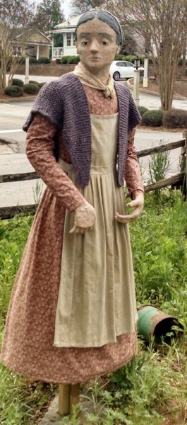 Early morning visitors to the gardens at Clarkesville’s Mauldin house have been doing a double take. A new sculpture of Tasha Tudor by Clarkesville artist Cecile Metivier adorns the garden. Metivier created the life-like sculpture out of fabric, paper mache’ and fiber over chicken wire to replace the former scarecrows, Daisy and Violet. Tasha Tudor, 1915-2008, was a much beloved illustrator of Children’s books who won a Caldecott for her work on “Mother Goose.” According to her family, Tudor loved to spend time in her extensive garden and drew inspiration from the natural world.