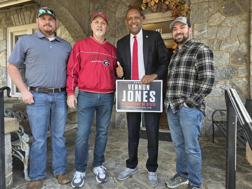 From left: Channing Watts, candidate for Clayton City Council Post 1; Roy Quilliams, Mayor of Clayton; Vernon Jones, former Georgia State Representative; and Colt Woodall, candidate for City Council Post 2. The local city council candidates and the mayor assist in the costume contest. Mr. Jones visits Northeast Georgia in his campaign tour for Secretary of State. (Carly McCurry / Now Habersham)