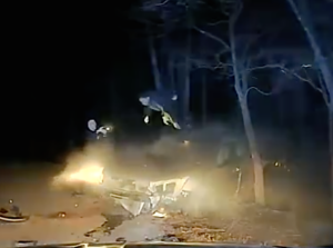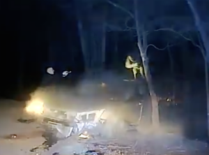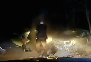 The officer approaches the wrecked vehicle with his gun drawn. He orders the occupant to remain inside. “Stay right there. Don’t you move. Do not move,” he shouts.