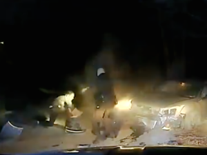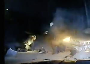 As the officer moves towards the driver side of the car he shouts repeated warnings to the suspect. He then radios Dispatch telling them he’s unable to see inside of the car, apparently because of the smoke from the engine fire. “He’s trying to break the glass and get out. I don’t know if he has anything. I can’t see him,” the officer says over the radio. At that moment the subject exits the vehicle through the back window, runs across the top and hood of the car and lunges at the police officer, hitting the ground.