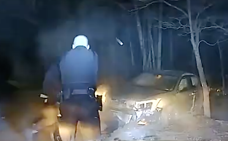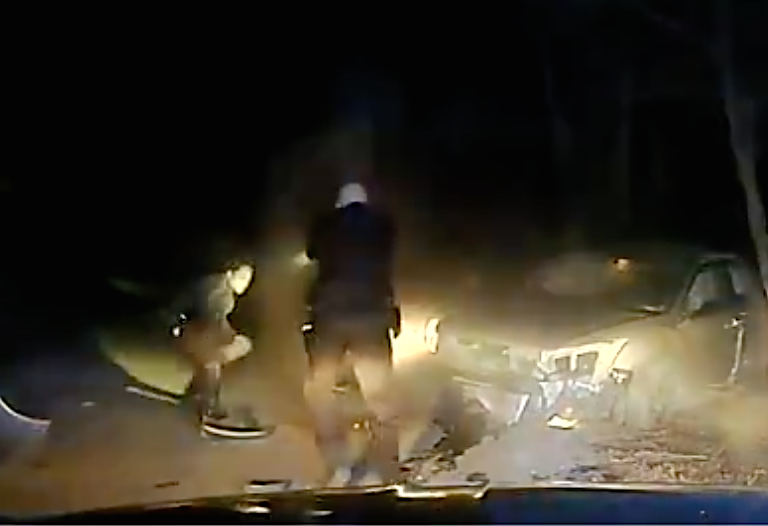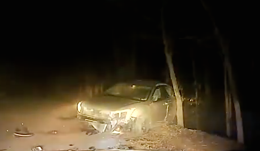 The officer approaches the wrecked vehicle with his gun drawn. He orders the occupant to remain inside. “Stay right there. Don’t you move. Do not move,” he shouts.