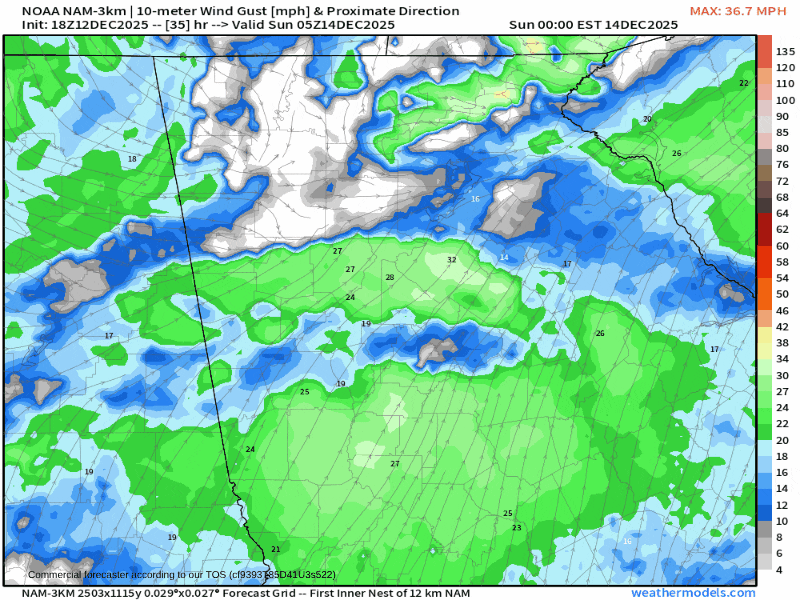 Temperatures will start off in the 30s in the mountains at midnight and quickly drop into the 20s by 8-9AM. Outside the mountains, temperatures will likely “bottom out” around 33-38° for most of the day. Winds will also become very gusty behind the front. Winds will be strongest in the mountains where gusts of 35-40MPH are possible at higher elevations, with the rest of the region seeing gusts of 30-35MPH possible. The strongest winds will occur around lunch on Sunday before they gradually drop off.