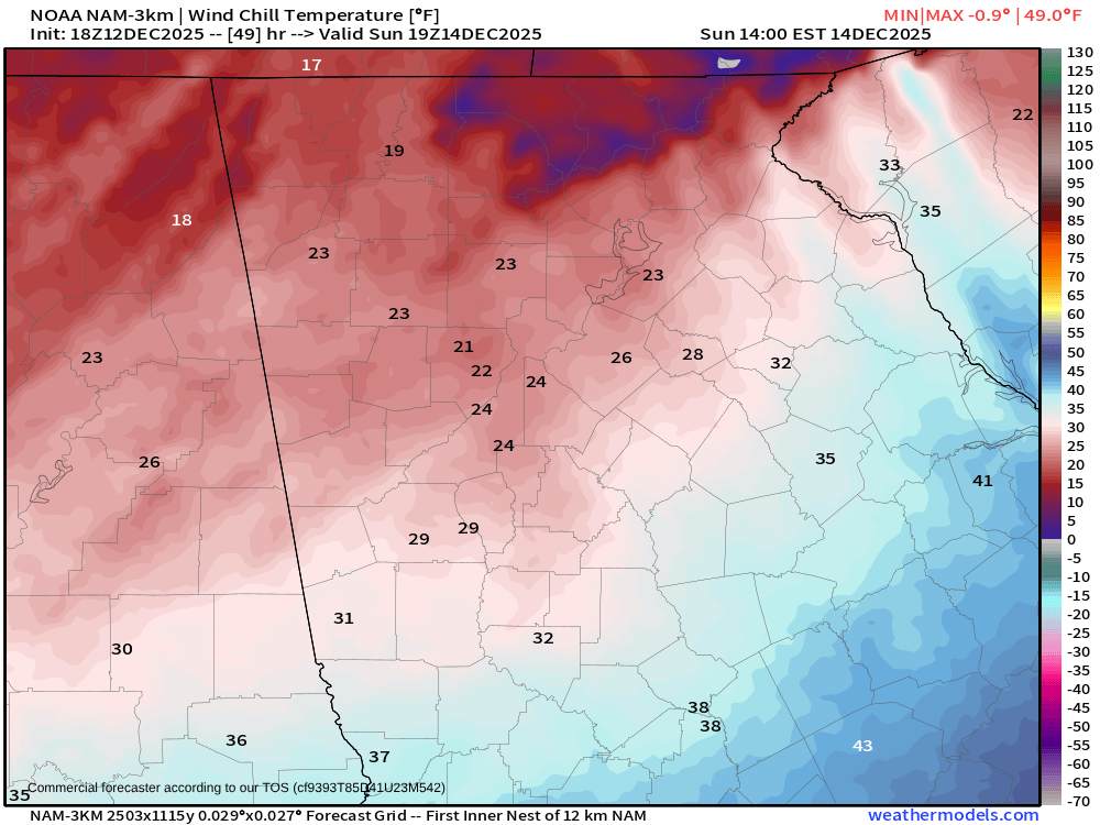 Wind chills will fall into dangerous territory across the mountains on Sunday afternoon. Values of 5-10° are possible through the morning and afternoon hours. Areas outside the mountains will see wind chills of 20-25°. By evening, wind chills could dip below zero in the mountains and into the low teens for the rest of the region. You’ll certainly want to bundle up, especially over the mountains.